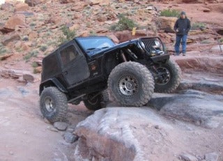 "This daily driver has been around the country, on different trails that mostly favor rocks. It has a DynaTrac ProRock 44 on the front, heavy duty ball joints, 4:88 gearing w/Eaton E-Lockers front and rear, RockCrawler 5.5" Long Arm Coil-Over suspension w/4 Link on Rear Axle, RockCrawler Pro Series Aircraft Al Tie-Rod, Poison Spyder Al sliders and flares.